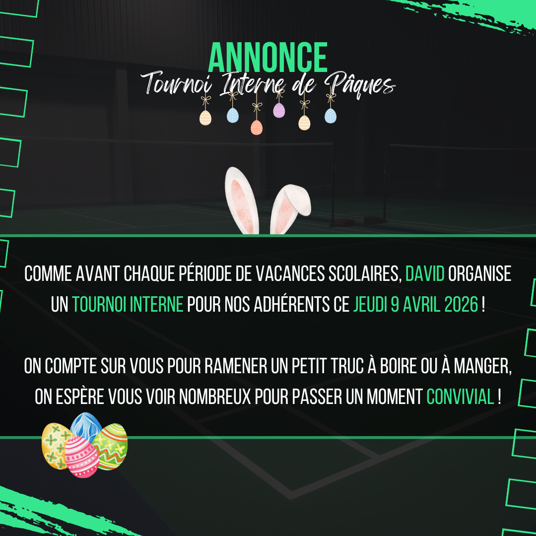 Comme chaque jeudi avant les périodes de vacances scolaires, David invite les adhérents du LVM pour le traditionnel tournoi interne ! 🥳 Rendez-vous ce jeudi 9 avril dès 20h30 ! 🏸 On compte sur vous pour ramener un p’tit truc à boire ou à manger ! 🧃🥨